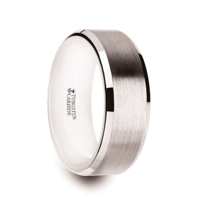 ANTARES White Tungsten Brushed Center Men’s Wedding Ring with Polished Beveled Edges & White Interior