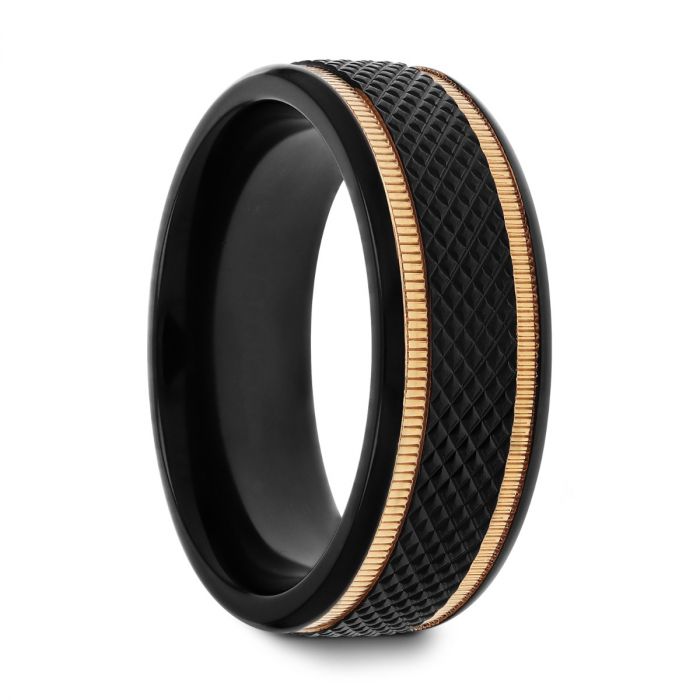 BAROQUE Black Titanium Diamond Pattern Brushed Finish Men’s Wedding Ring with Gold Milgrain Grooves