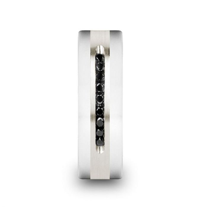 BLACKSTONE Wedding Band with Brushed Silver Inlay Center and 9 Channel Set Black Diamonds