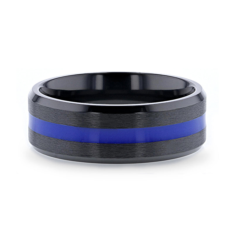 DECLAN Men’s Beveled Black Ceramic Brushed Finish Wedding Band with Polished Blue Stripe