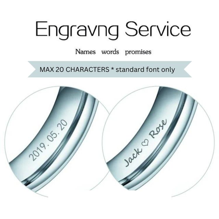 Our engraving service allows you to add a personal touch to your cherished jewelry. You can customize your piece with up to 20 characters, creating a meaningful message or special date that holds sentimental value. Please note that engraving is not covered during sizing, and an additional cost may apply for re-engraving after resizing. Make your jewelry uniquely yours with our expert engraving service, adding an extra layer of sentiment and love to your treasured pieces.
