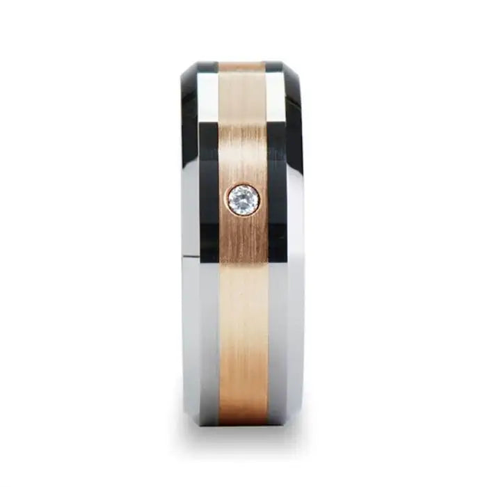 ENZO Beveled Tungsten Carbide Ring With Diamond and Rose Gold Inlaid