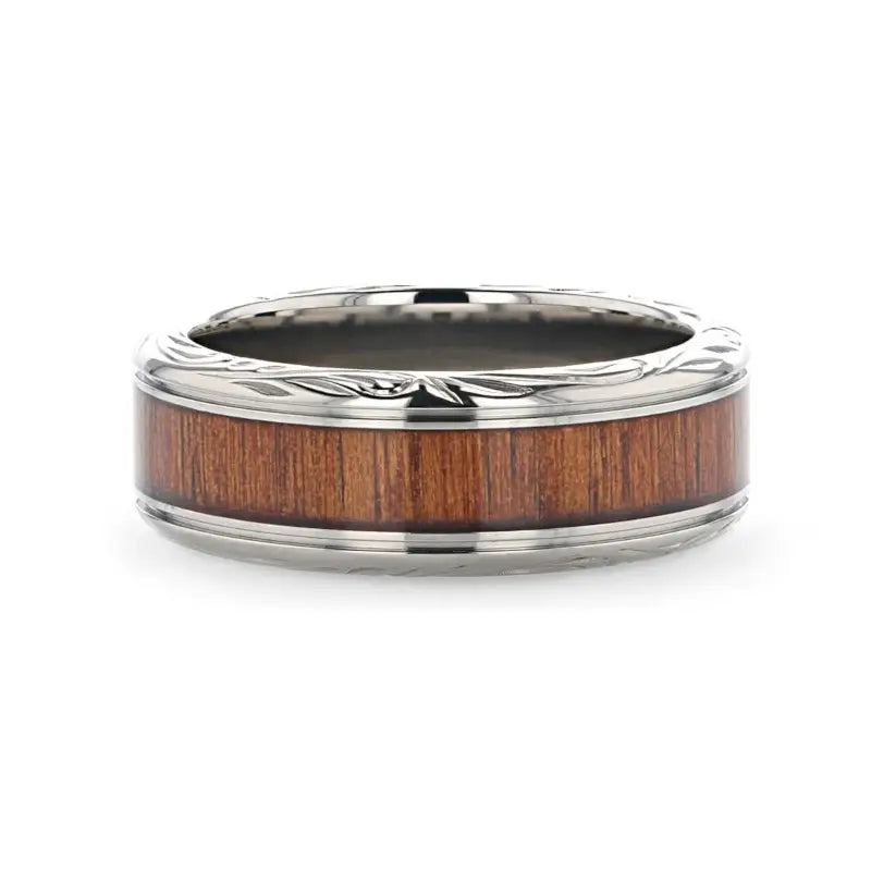 OHANA Koa Wood Inlaid Titanium Men’s Wedding Ring with Intricate Edges