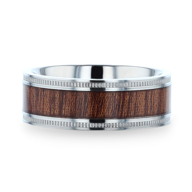 MOCHA Koa Wood Inlaid Titanium Men's Wedding Ring With Polished Milgrain Edges