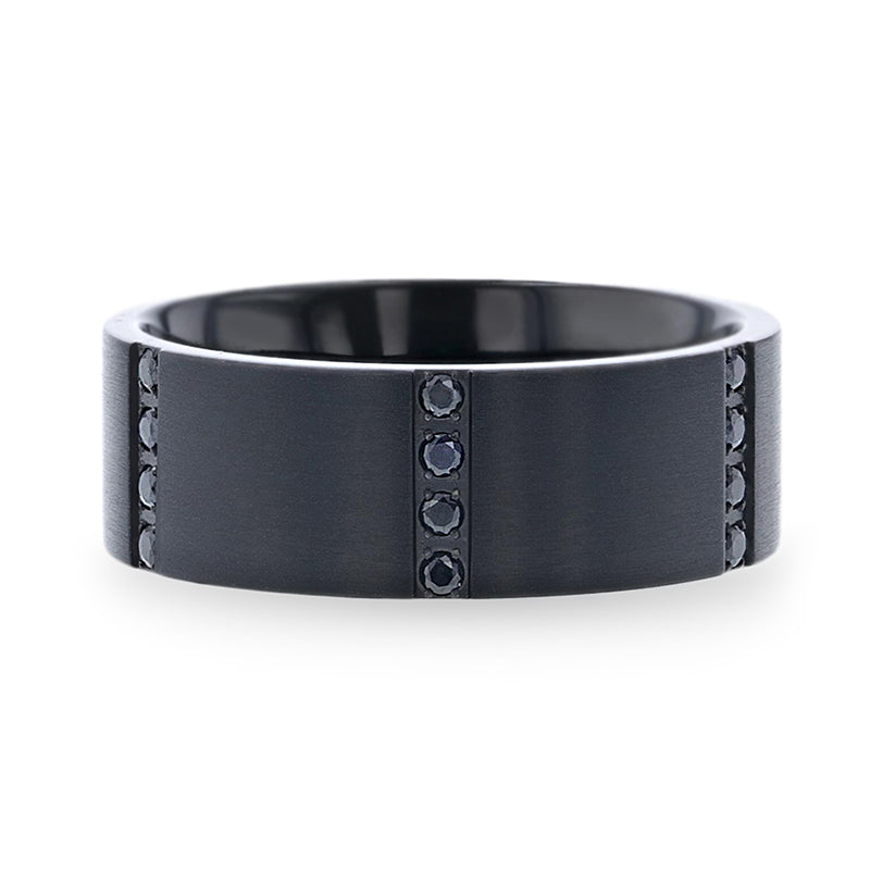 MYSTERIOUS Flat Brushed Black Titanium Men's Wedding Ring With 6 Sets of Quadruple Black Sapphires In Horizontal Channels