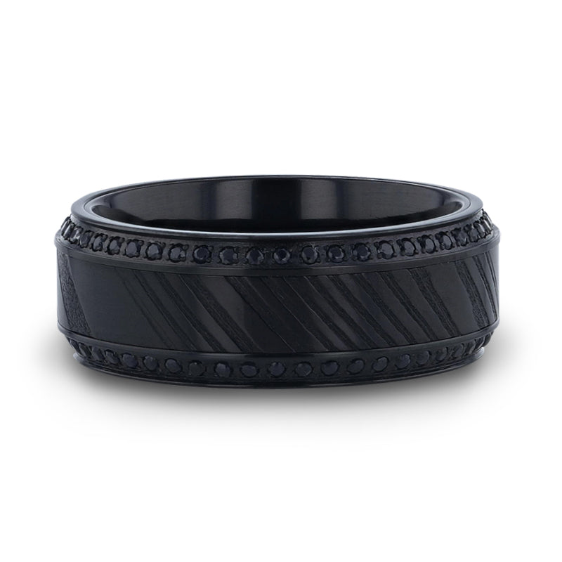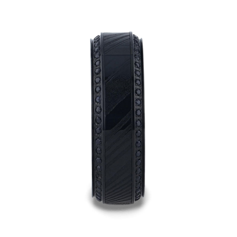 TROPHY Black Damascus Steel Inlaid Polished Black Titanium Men's Band With Black Sapphire Beveled Edges