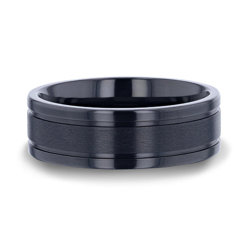 Brushed Center Black Titanium Men's Wedding Band With Polished Dual Offset Grooves