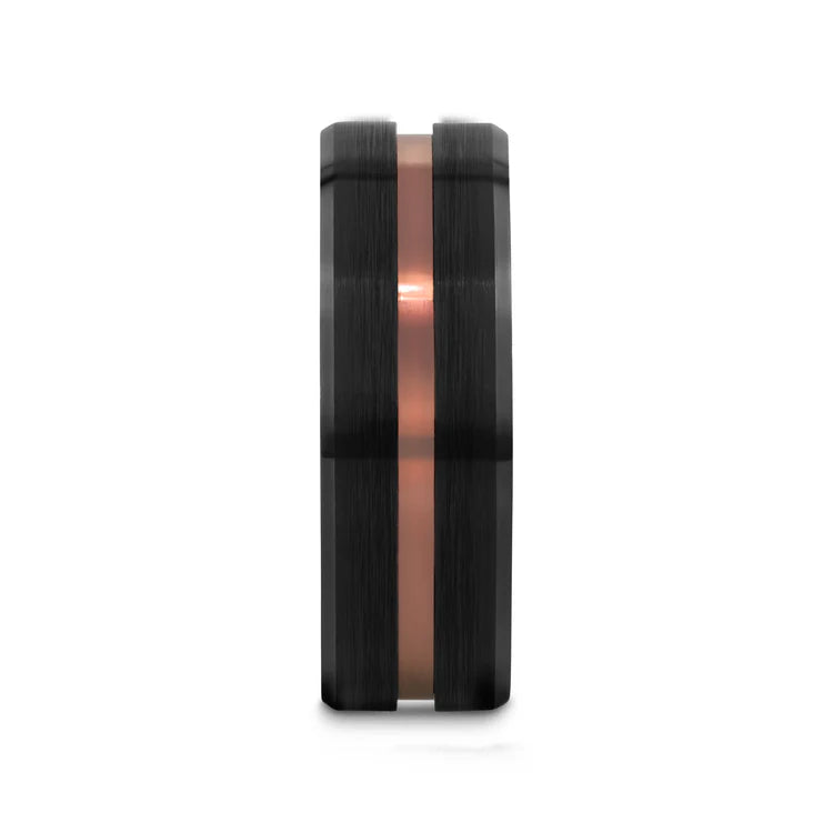 NEVAN Flat Brushed Black Tungsten Men’s Wedding Band with Espresso Groove Center