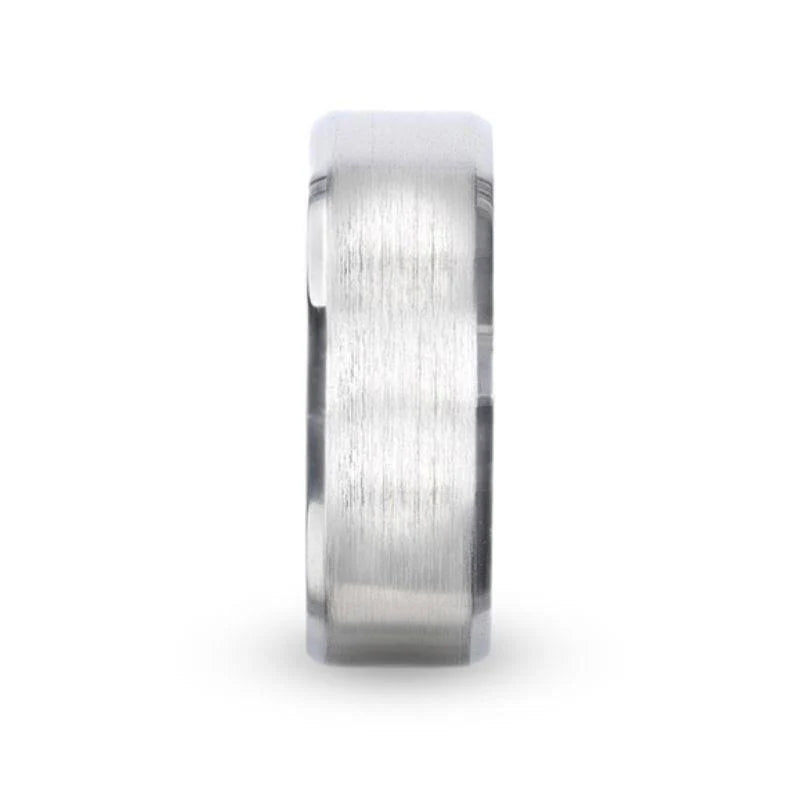 CHAMPION Flat Brushed Center Titanium Men's Wedding Band with Black Sapphire Polished Beveled Edges