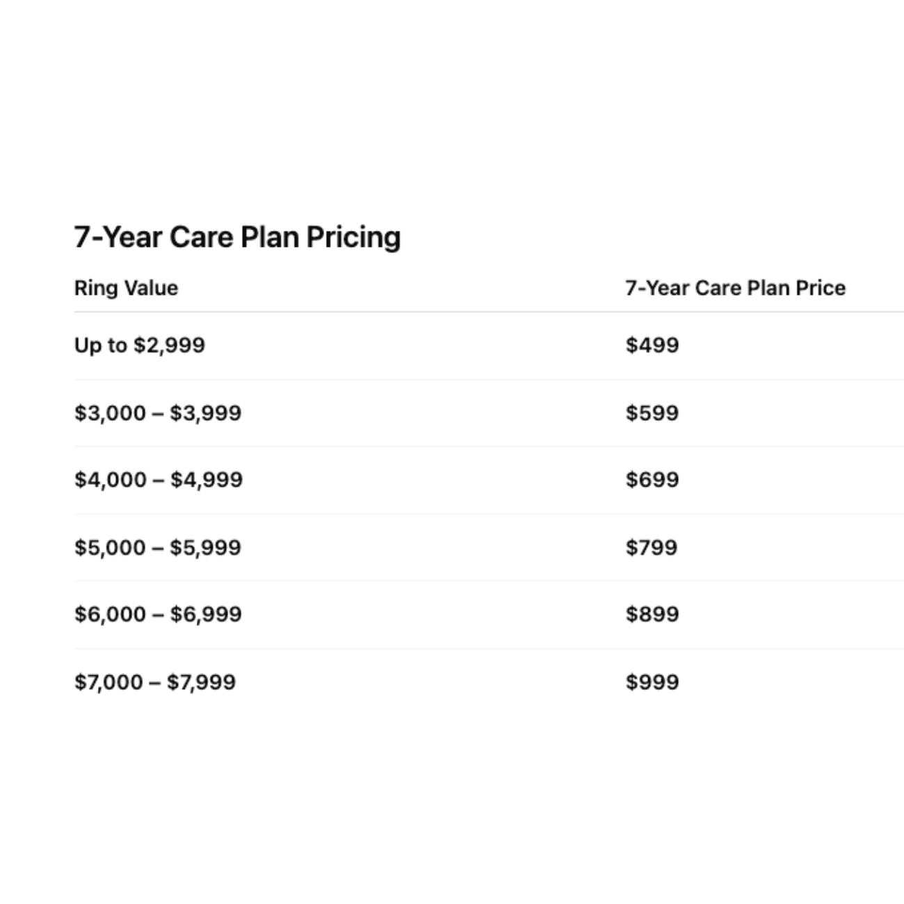 A 7-year plan covers you through the period when your ring sees the most use, keeping it secure, polished, and beautiful — without unexpected maintenance costs. It’s long enough to give true peace of mind while keeping the plan affordable and without any surprise changes.