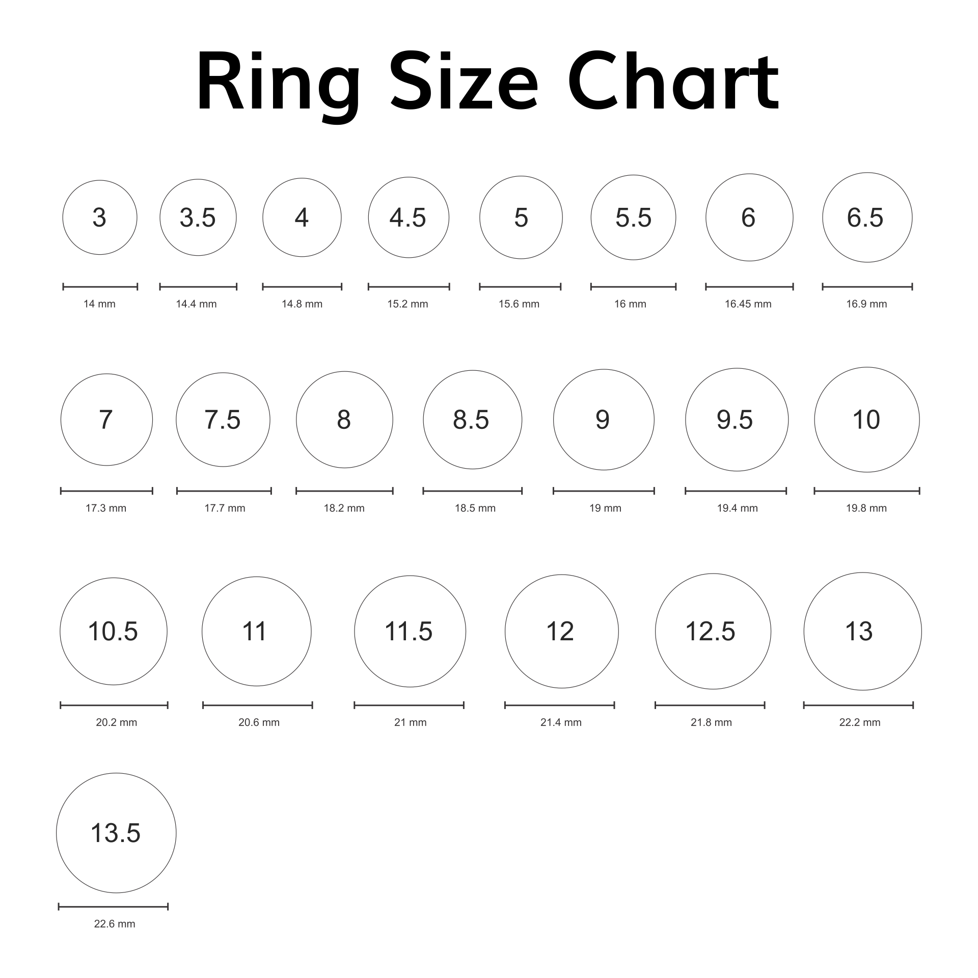 4. Use the ring size chart below to compare your measurement to the standard ring sizes.